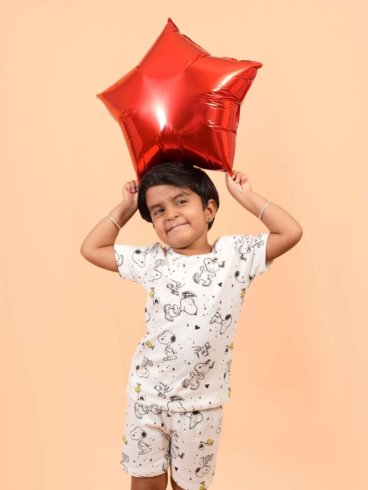Let your little one stay comfy and cute in our White Half Sleeve Co-ord Set, featuring an all-over Snoopy print that brings smiles all around. Made from 100% cotton interlock, the fabric is buttery soft, breathable, and perfect for delicate skin. The half-sleeve T-shirt and comfy shorts make this set ideal for everyday wear, naps, or playful outings.